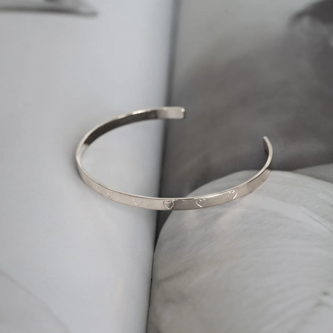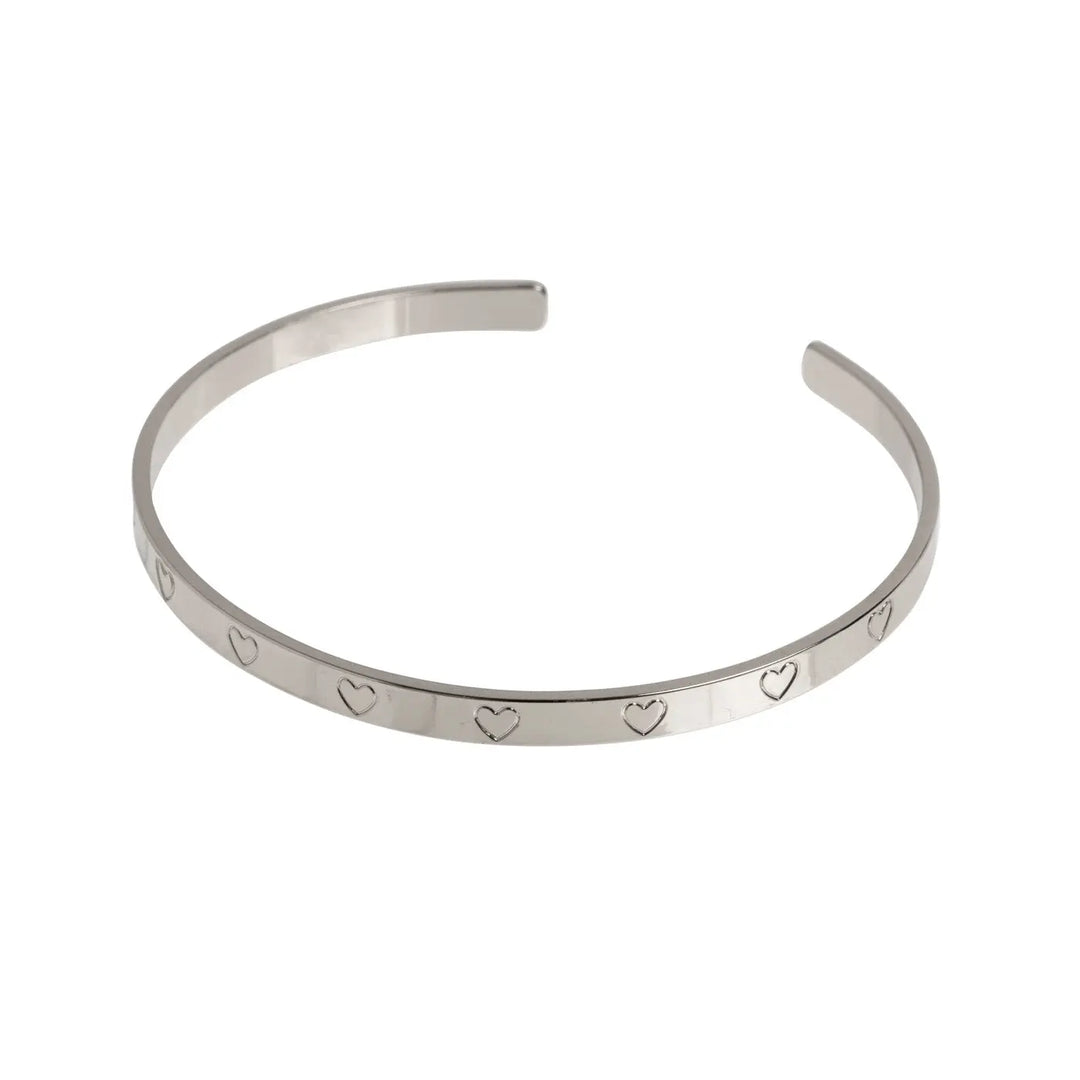 中空のハート アウトライン デザインの可憐でミニマリストなブレスレット。誰にでも似合うデザインで、「ハート アウトライン スタッド イヤリング」と合わせて着用するのに最適です。