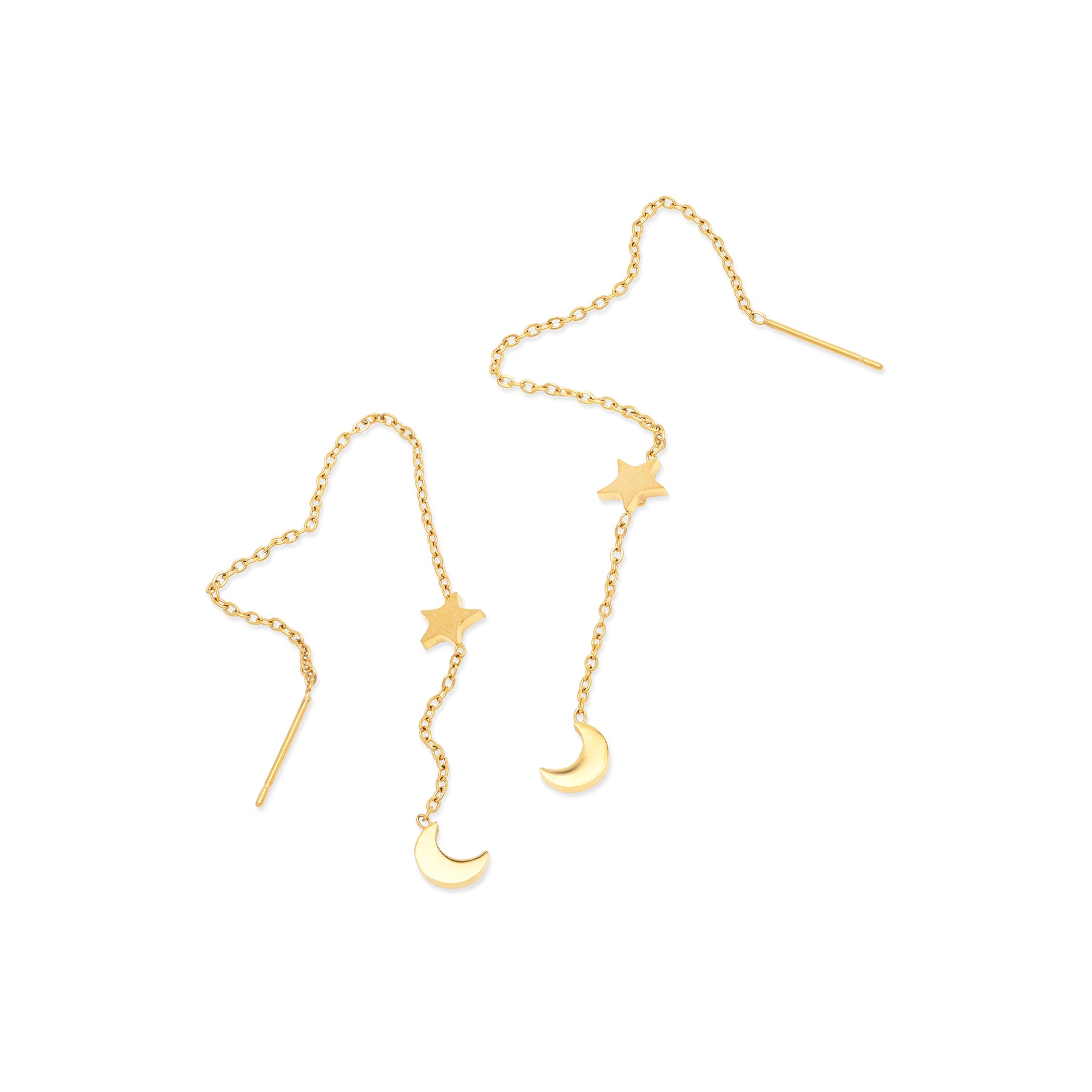 Trendy chain earrings with moon and stars for effortless edge. These dangling chain earrings are crafted from water-resistant, tarnish-free stainless steel for a modern look. Available in silver & gold to fit your style and needs.