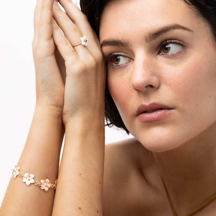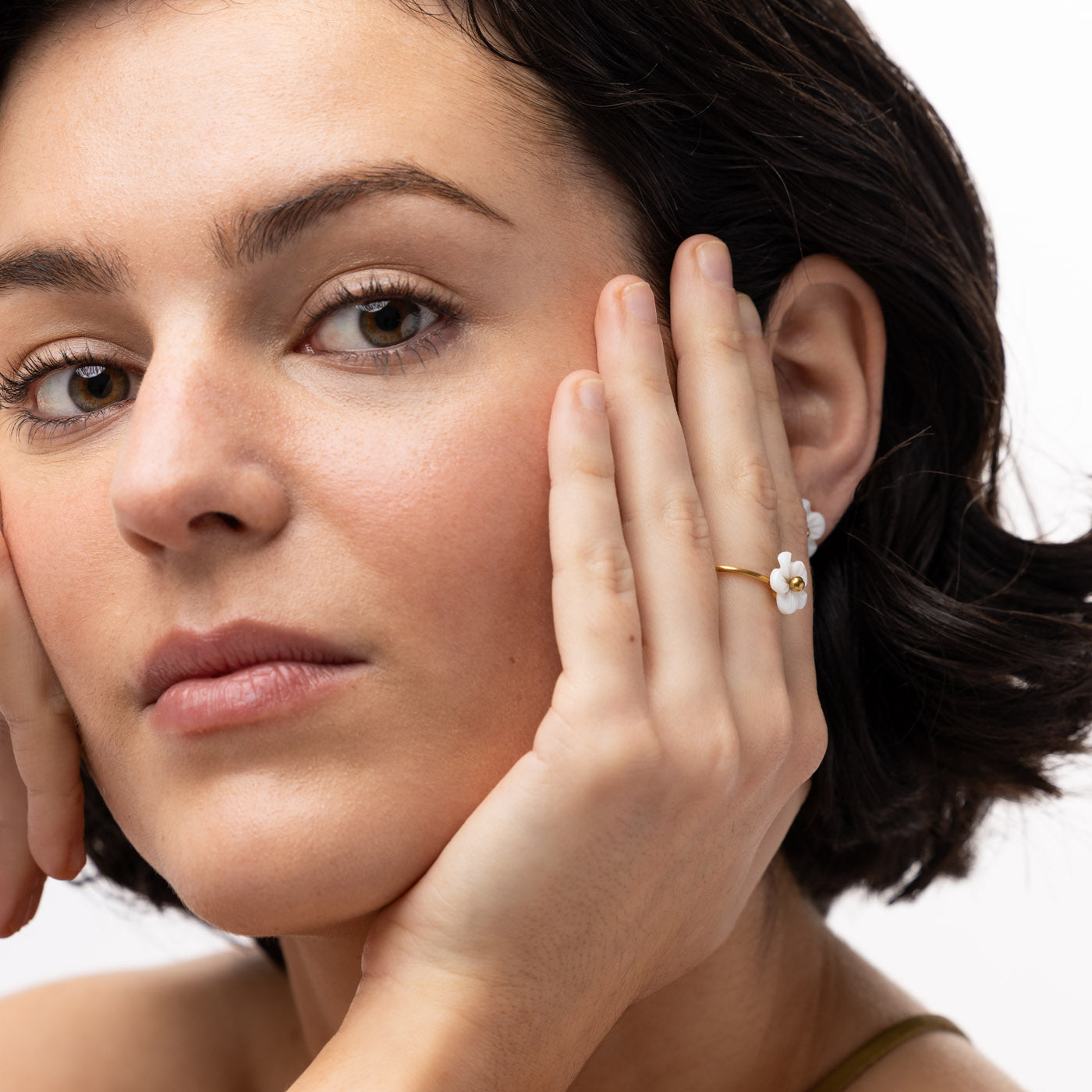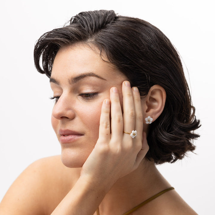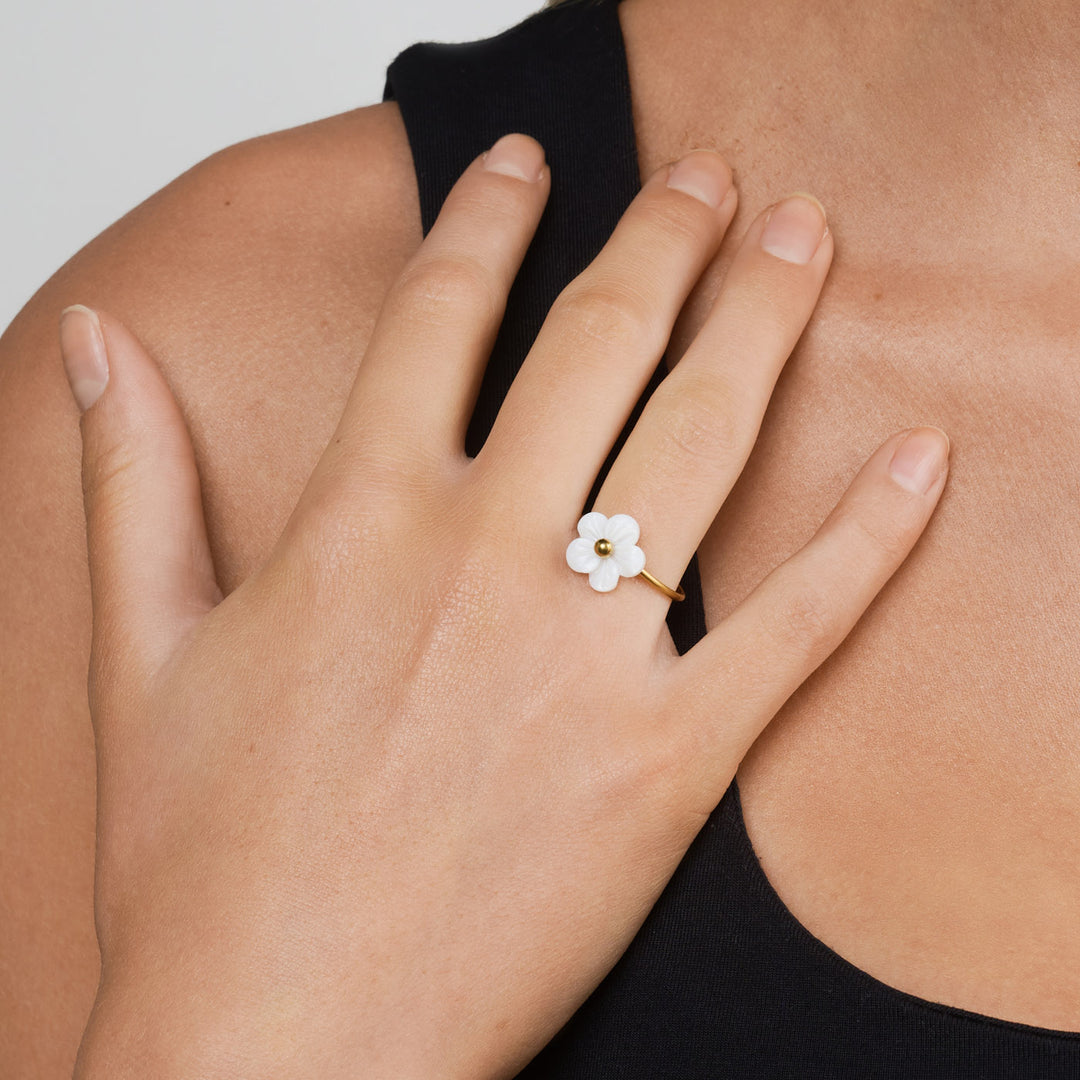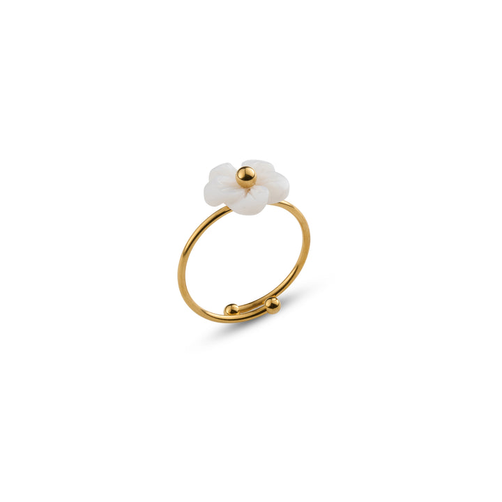 A ring that blooms with you! The Ellen flower ring is an adjustable ring crafted from water resistant stainless steel, meaning it’s ready for all your daily adventures - without losing its shine. The soft white floral detail brings a fresh, dreamy vibe to any outfit. Wear with our matching pieces Ellen - White Flower Stud Earrings Stainless Steel.