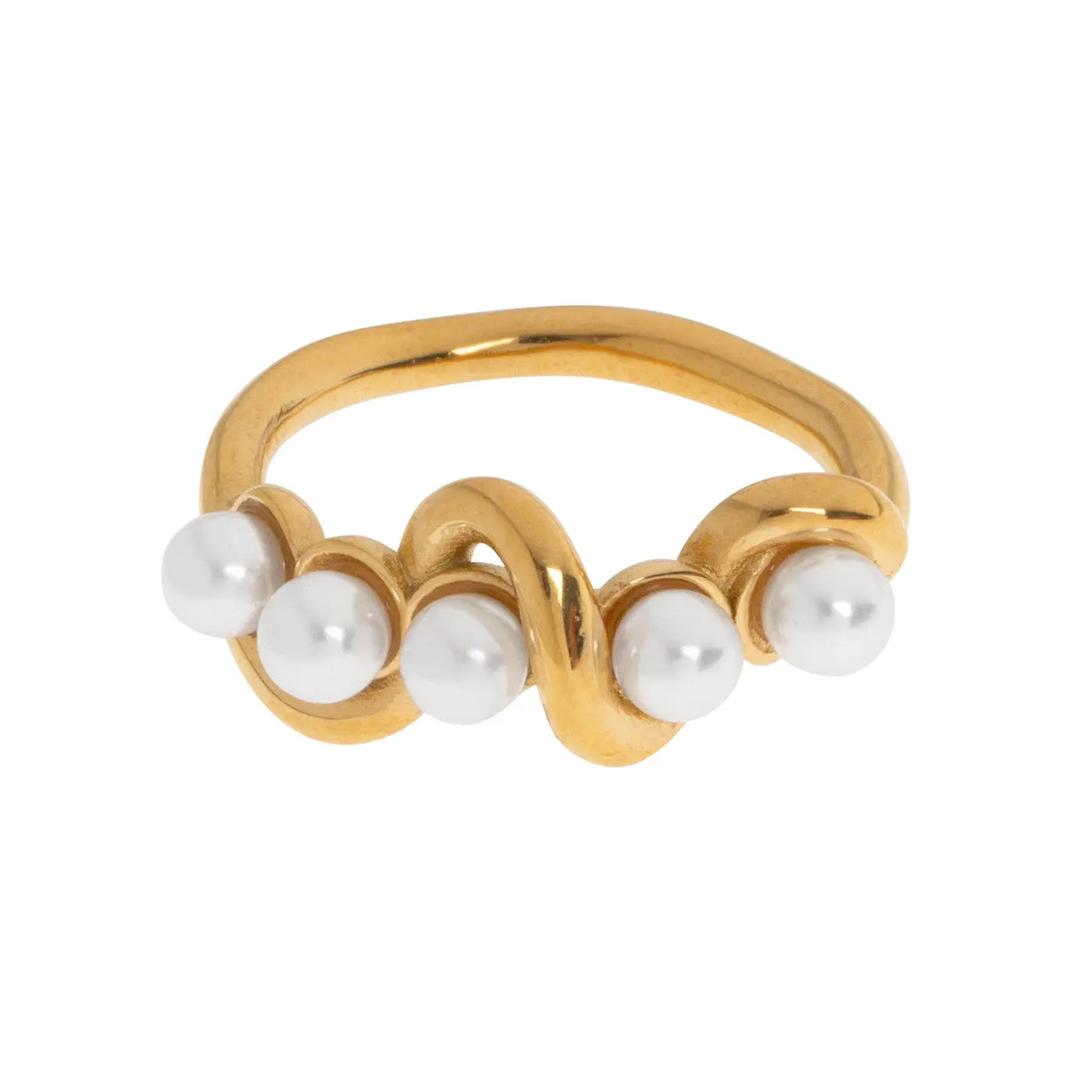 This gorgeous ring is set with five faux pearls placed on an asymmetric gold band. A gorgeous ring that will elevate your outfit. A classy piece for sure.