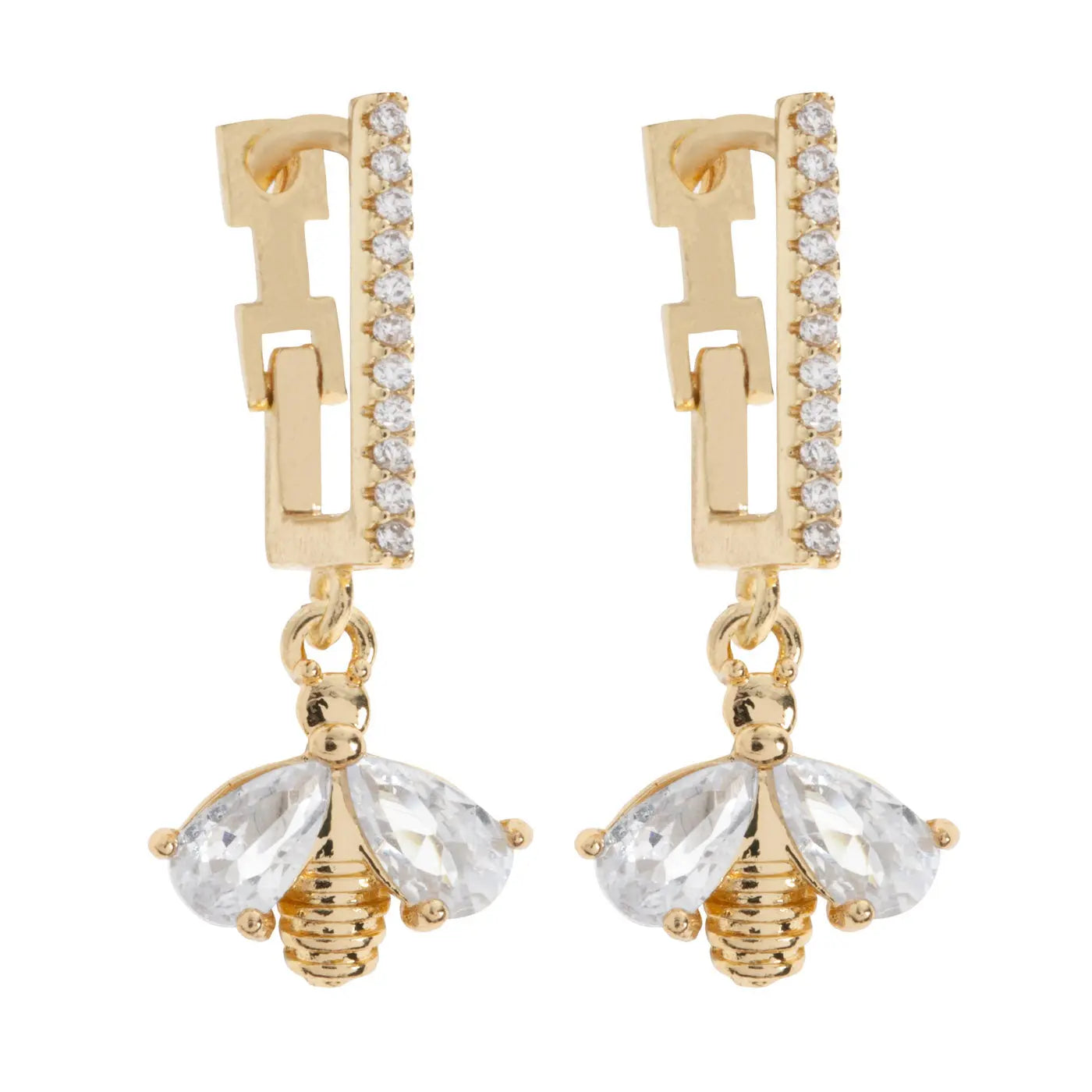 Take a look at these extraordinary earrings. The hoop is shaped as a rectangle and is bedazzled with cubic zirconias. The pendant is a lovely bee with crystal stones as wings.