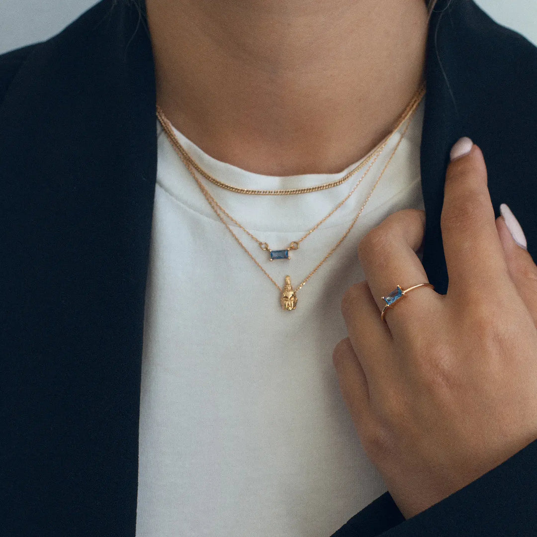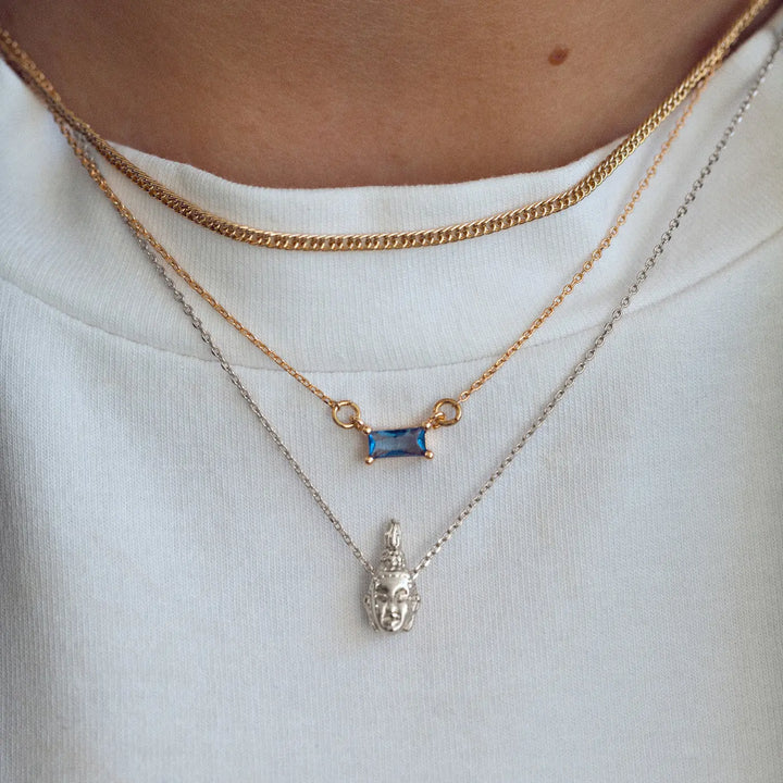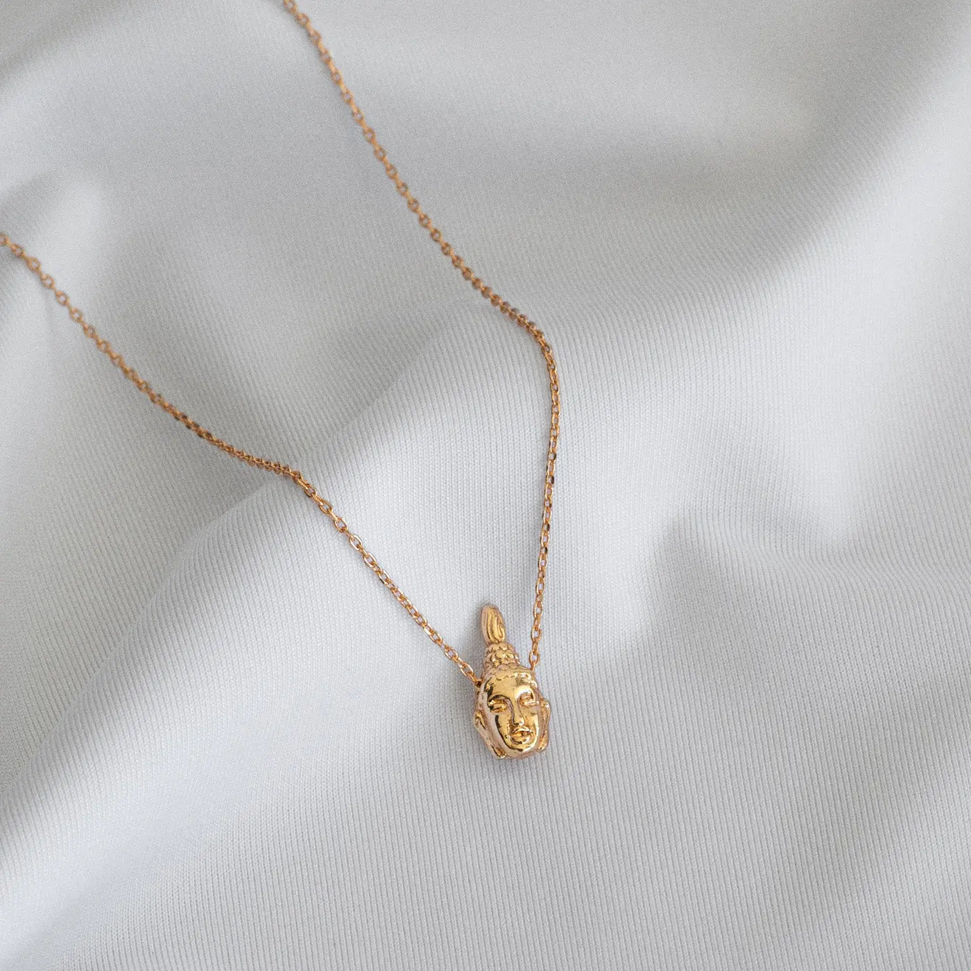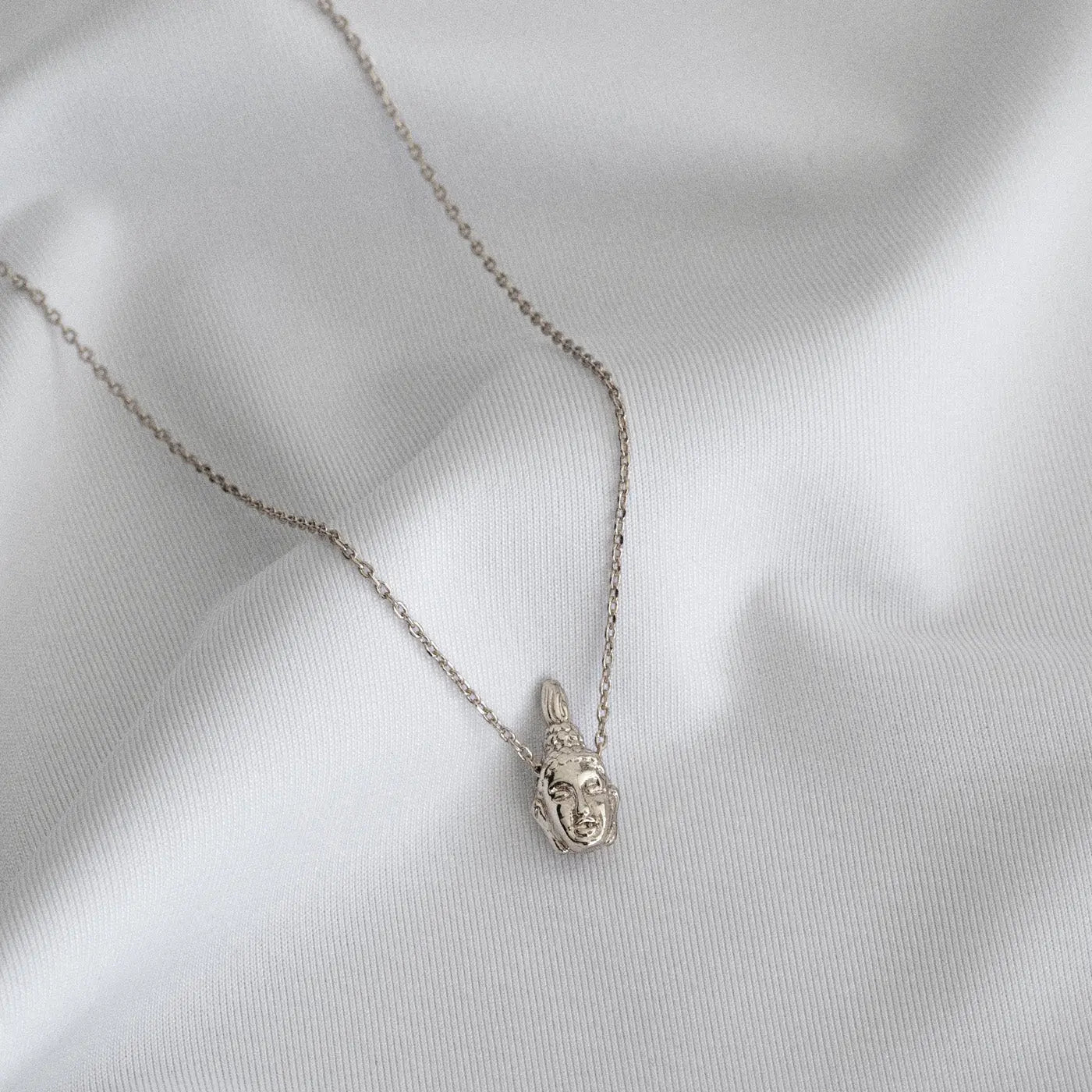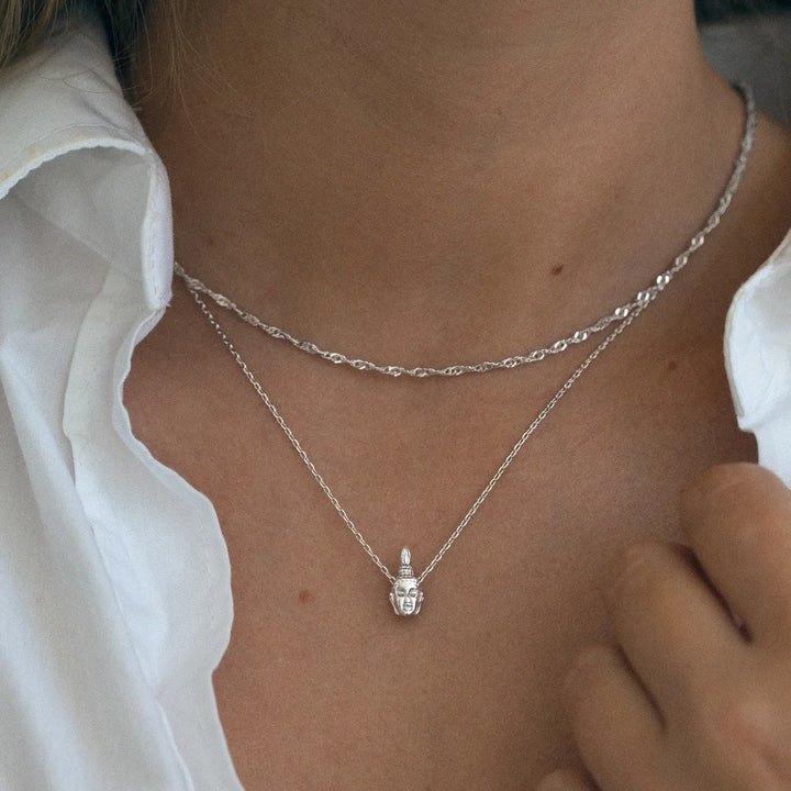 A minimalistic and beautiful pendant necklace resembeling a Buddha head on a thin chain, in silver. The necklace is perfect to wear as it is, or style with another simple chain.