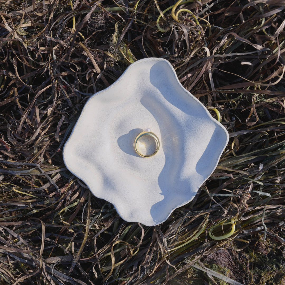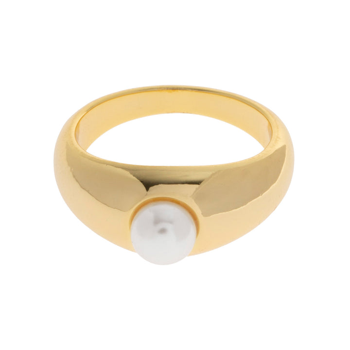 This chunky ring with a pearl combines a bold, trendy design with an elegant touch. The eye-catching pearl provides a sophisticated contrast to the striking ring, creating a sleek statement piece. Perfect to wear as a unique accessory, whether you're elevating a casual look or completing a party outfit. The pearl ring is plated in 18k gold.