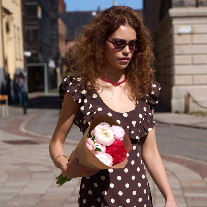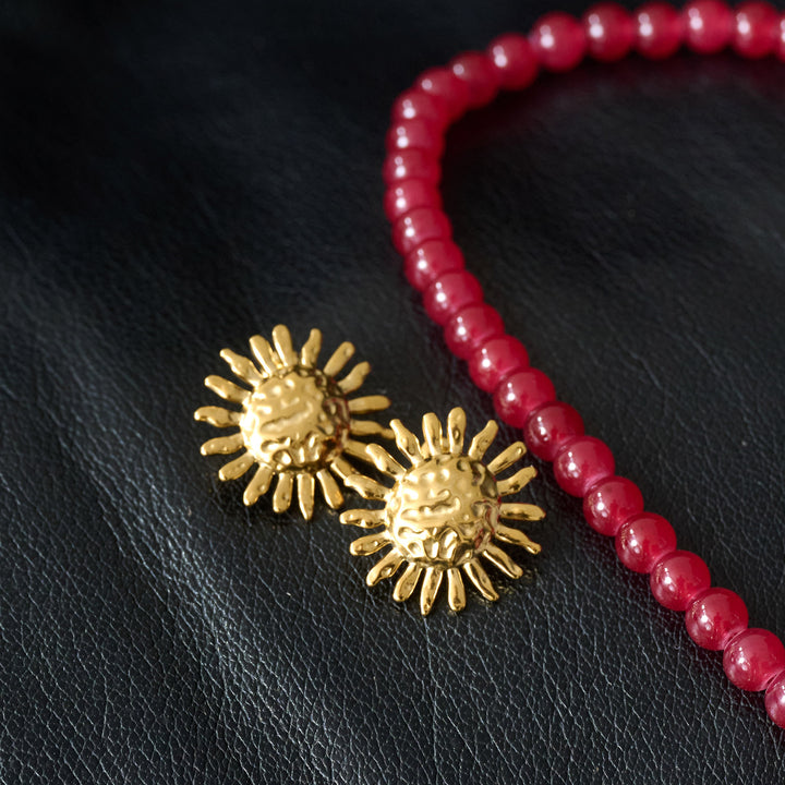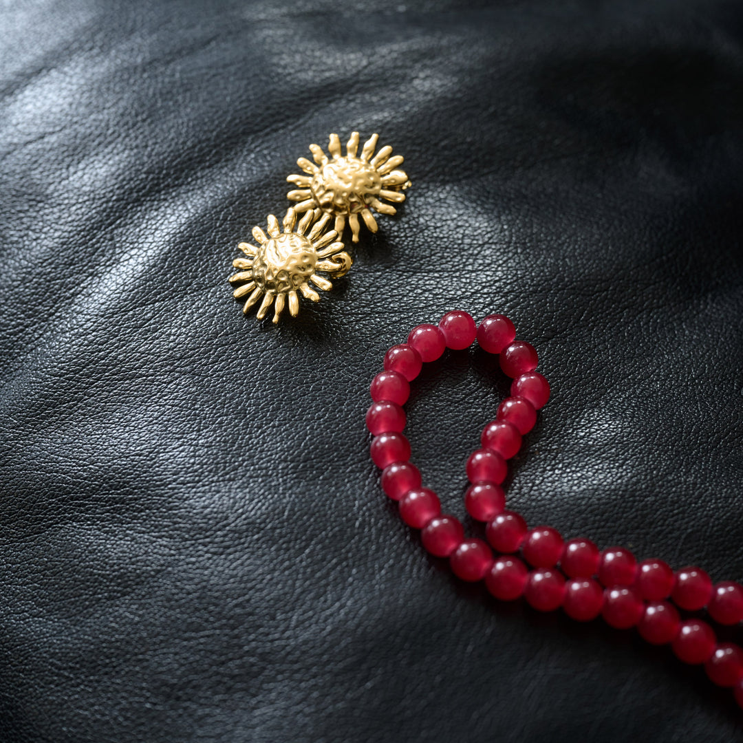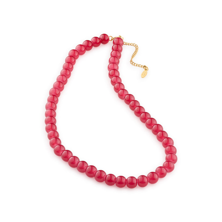 鮮やかな赤いガラスビーズを連ねた、大胆で遊び心のあるデザイン。重ね付けにも単独スタイルにも最適です。