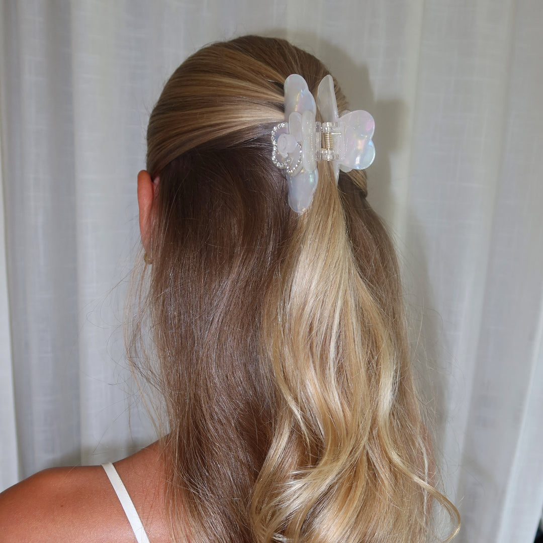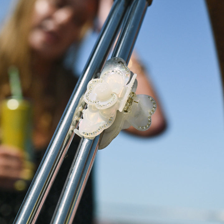 あなたの髪の新しい親友が登場!この夢のような虹色の白いクロークリップは、かわいい花柄デザインと控えめな輝きを特徴としています。すべての象徴的な瞬間に手軽なグラムを。