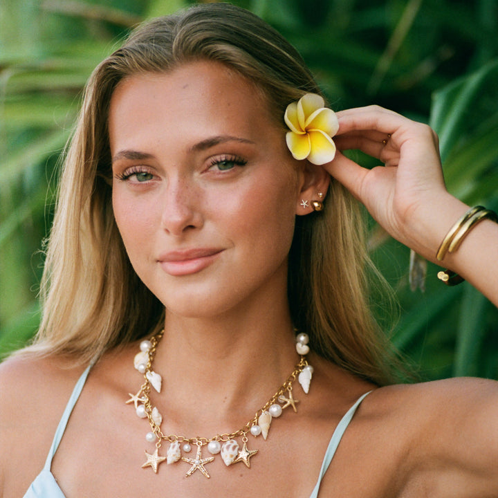 海とエレガンスが出会う場所。Nora Shell Charm Necklaceは単なるジュエリー以上の存在です。それは一つの声明です。繊細な貝殻、真珠、ヒトデのチャームがあしらわれた大胆なゴールドチェーンを特徴とし、このネックレスは最も洗練された方法で海の美しさを体現しています。海辺のシックな雰囲気を加えたい時も、日常のスタイルを格上げしたい時も、Noraは手軽にラグジュアリーを演出するあなたの頼れる一品です。単独で着けても、重ね着けしても—どちらにしても、称賛の声が期待できます。