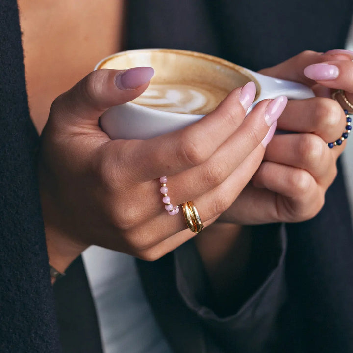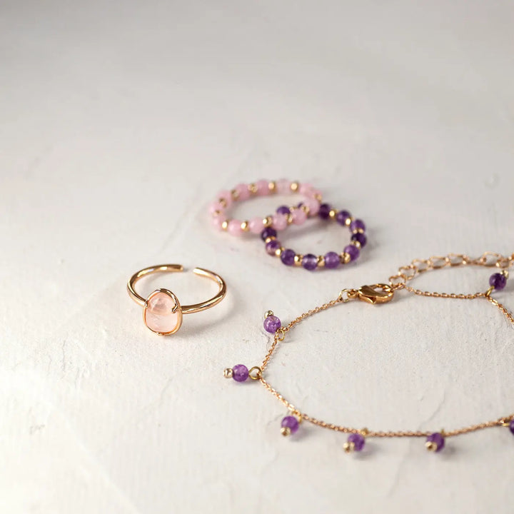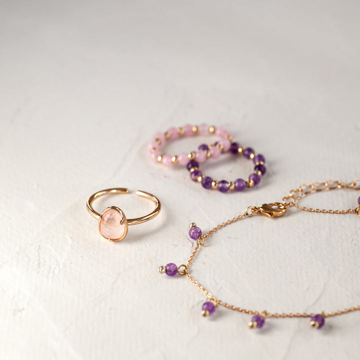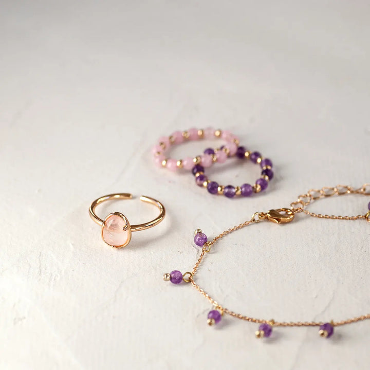 ローズクォーツは愛と思いやりの石です。愛を引き寄せ、怒りや嫉妬を追い払います。傷ついた心を癒すのに役立ちます。この石を使えば、心を開き、再び信頼することを学ぶことができます。このチャーミングなリングを毎日の必需品にして、自分と調和していきましょう!