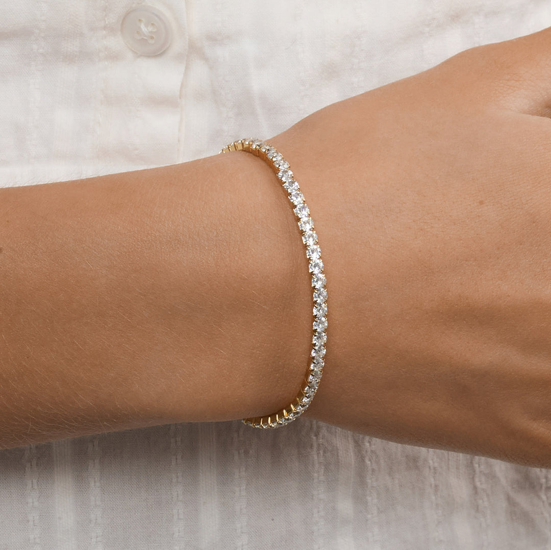 クラシックが大胆に出会う。サニーのクリスタルテニスブレスレットは、洗練された耐水性ステンレススチールで手首に輝きを加えます。昼も夜も輝きを放ちます。