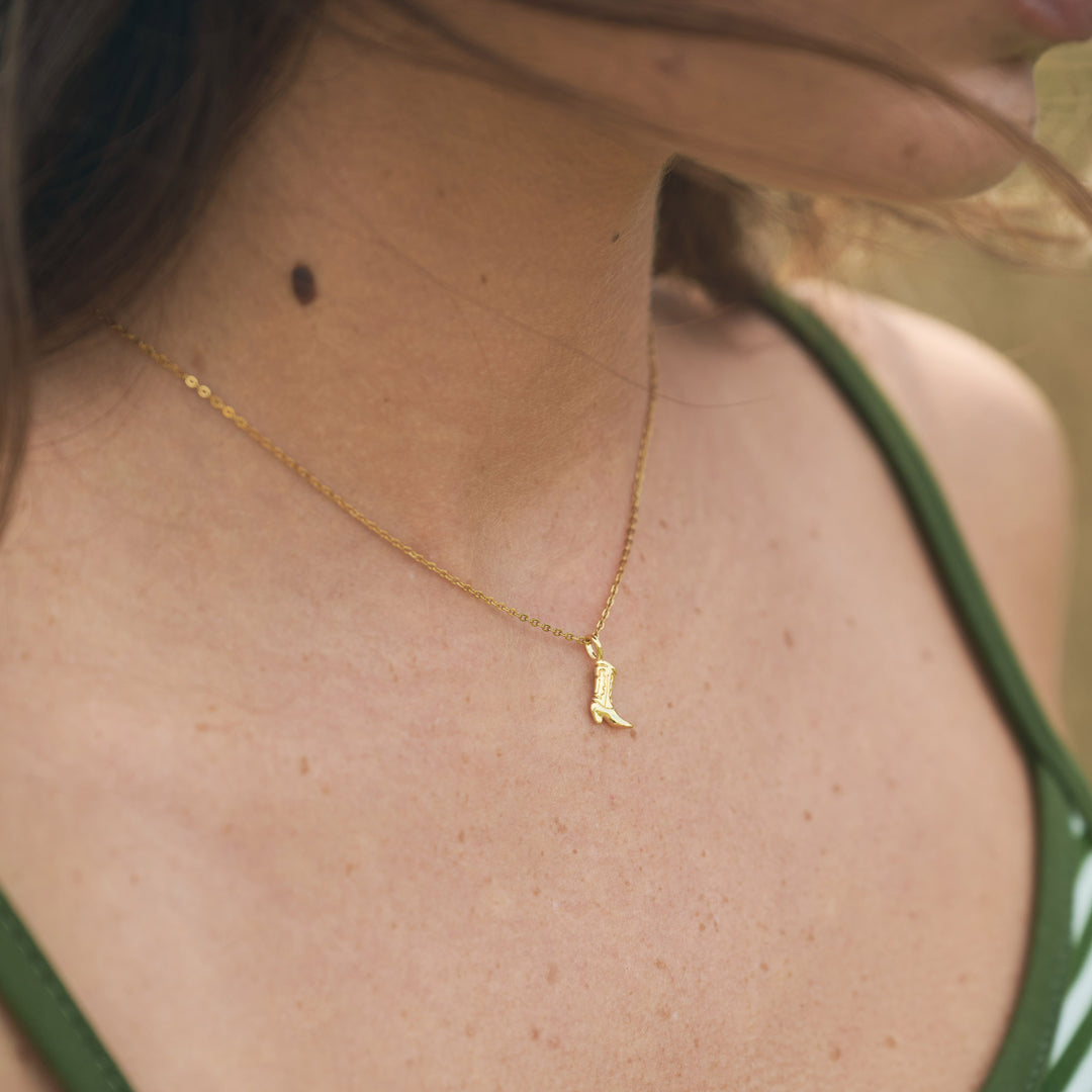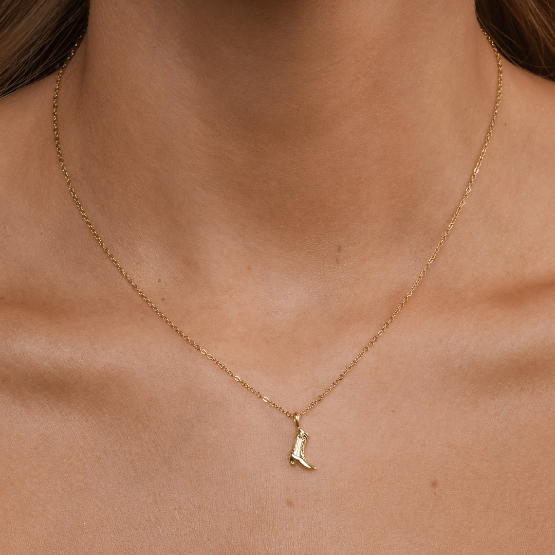 西部の雰囲気、シティスタイル。Wendy Cowboy Boot Necklaceはクラシックな西部の服装からインスピレーションを得て、モダンで遊び心のあるペンダントに仕上げました。カウボーイブーツ愛好家でも、ちょっと変わったアクセントを求める方でも、このネックレスはヴィンテージアメリカーナとクールなガールエナジーの完璧なミックスです。
